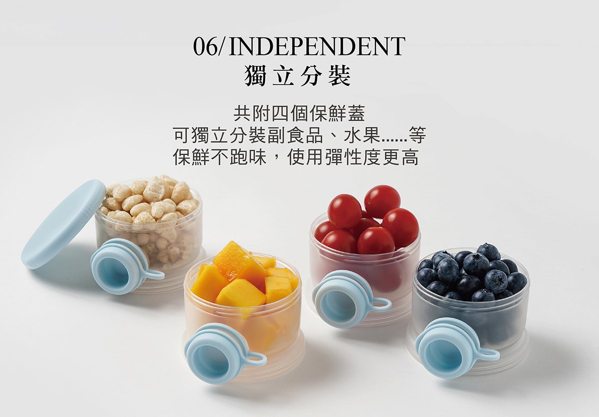 貼心多用途,附贈盒蓋可單獨使用每個隔層分裝副食品或小點心,嚴選PP材質輕巧耐摔,不含雙酚A,外出攜帶不佔空間,預先填裝奶粉讓調乳更方便省時,定格定量精準掌握寶寶餐量。